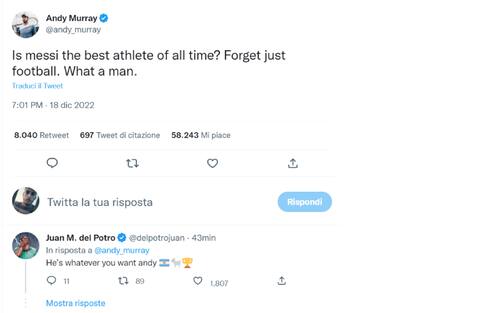 - Il campione del tennis Andy Murray allarga i confini di Messi: "Il miglior atleta di tutti i tempi è lui?" si chiede il britannico, ma per il collega e argentino Del Potro in questo momento si vuole solo godere la vittoria