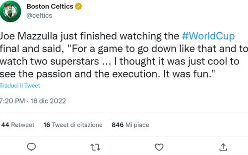 - L'ultimo atto di Qatar 2022 è stata seguitissimo anche nel mondo Nba, divertendo molto il coach dei Celtics, Joe Mazzulla