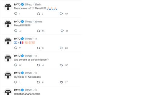 - Una finale molto attiva sui social per Pato, ex attaccante rossonero e soprattutto brasiliano. Dalla derisione dei primi tweet dopo la rimonta francese... alla riconoscenza verso il genio di Messi "Te lo meriti tanto"