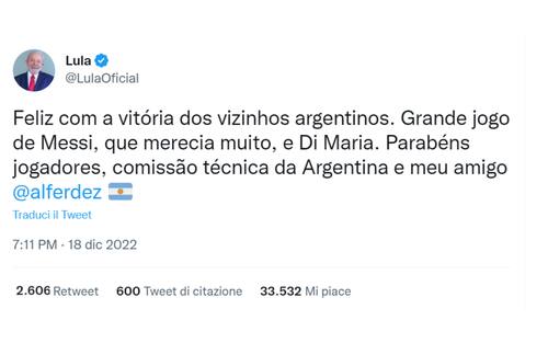 - Sportività mostrata in campo politico, dove a congratularsi con l'Argentina è stato il brasiliano Lula