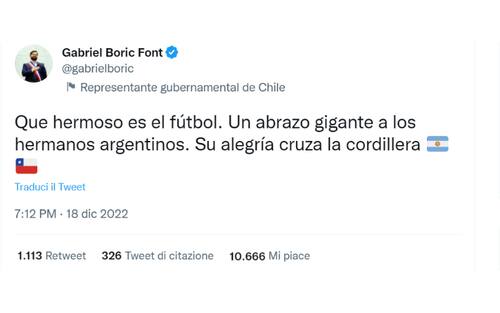 - E anche il capo di Stato cileno manda un abbraccio "ai suoi fratelli argentini. Che bello il calcio"