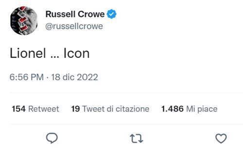 - Una finale che ha emozionato anche il mondo del cinema, tra gli attori non è mancato il commento del 'gladiatore' Russell Crowe che ha definito Messi come "icona"