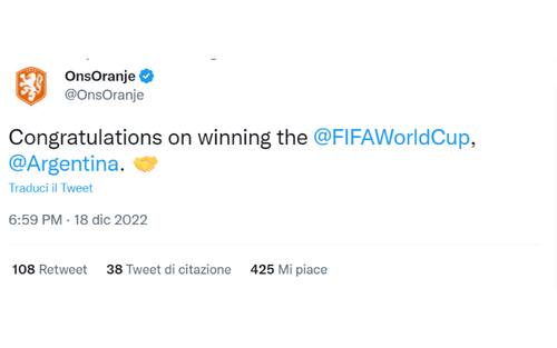 - Applausi anche dall'Olanda che, contro l'Argentina, è uscito in questo Mondiale e ha perso la finale nel '78