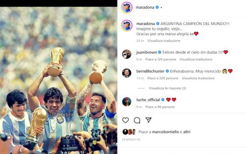 - Le prime congratulazioni arrivano dal profilo Instagram di Maradona: "Immagino il tuo orgoglio"