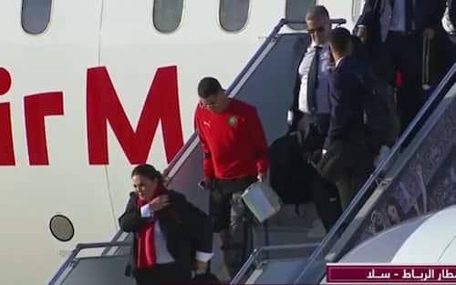 Tra i primi a scendere dalla scaletta dell'aereo c'è l'allenatore Walid Regragui, seguito da tutta la squadra