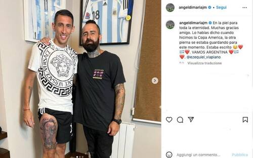 - Ed ecco il lavoro completato. Di Maria aveva anche profetizzato che avrebbe fatto questo tatuaggio: "Lo avevo detto quando abbiamo fatto la Copa America - ha aggiunto riferendosi al tattoo fatto dopo la vittoria del trofeo continentale nel 2021 -: l'altra gamba aspettava questo momento. Era scritto. Vamos Argentina!"