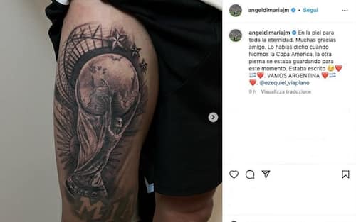 - Così ha potuto coronare il sogno di una vita, la vittoria della Coppa del Mondo. Un'emozione talmente grande che sarebbe stato impossibile non celebrarla a dovere. Ed è così che Di Maria ha scelto di tatuarsi il trofeo sulla pelle