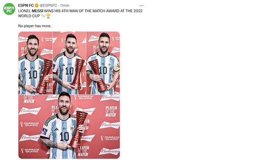 - Quello di stasera non è stato il primo premio di "migliore in campo" ricevuto in questo Mondiale. In 6 partite disputate finora, Messi l'ha vinto per 4 volte