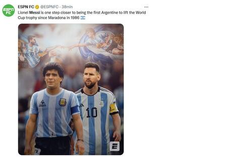 - L'Argentina raggiunge così la 6^ finale Mondiale della sua storia. Con Maradona ne vinse una (1986) e ne perse un'altra (1990). Messi ne ha già disputata una nel 2014 (persa contro la Germania) e adesso il popolo argentino gli chiede una vittoria per poterlo accostare a Diego