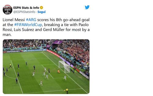 - E ancora: Messi - 5 gol in questo Mondiale - sale in vetta alla classifica marcatori di Qatar 2022 raggiungendo Mbappé. Il suo compagno nel Psg, però, viene staccato nella classifica dei marcatori "mondiali" ancora in attività, dove Leo è in testa (11 gol) dopo aver superato Thomas Muller (10)