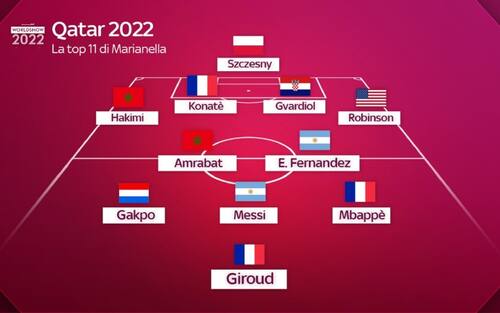 In attesa di conoscere quale sarà la squadra che trionferà in finale in Qatar, il nostro Massimo Marianella ha stilato la sua personale formazione ideale dei Mondiali. Una squadra stellare schierata con un 4-2-3-1: con tre giocatori la Francia è la Nazionale più rappresentata, seguita da Argentina e Marocco. E ci sono anche tre "italiani" (ovvero, calciatori che militano in Serie A): ecco la Top 11 di Massimo Marianella