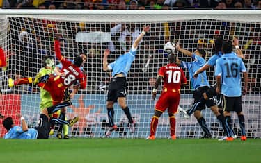 - In mezzo è una mischia da far west: a una prima deviazione di testa di Boateng, prova a porre rimedio Muslera ma, sull'uscita alta, il portiere della Lazio non riesce ad allontanare il pallone, che resta pericolosamente nel cuore dell'area. Lì si avventa il 10 Appiah, col mancino, da pochi metri: sarebbe gol, ma un clamoroso salvataggio di ginocchio di Luis Suarez nega la semifinale al Ghana.