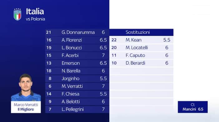 Marco Nosotti dà voti alti alla difesa, che ha permesso a Donnarumma di uscire dal match di Danzica poco impegnato. Molto bene Verratti e Lorenzo Pellegrini. Il peggiore in campo? Il campo, terreno che ha sfavorito il palleggio della nazionale di Mancini