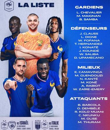 Rispondono ai nomi di Maignan e Theo Hernandez del Milan, Guendouzi della Lazio, Manu Koné della Roma e Marcus Thuram dell'Inter. C'è anche Lucas Chevalier, alla primissima convocazione in nazionale maggiore: è il portiere del Lille visto in Champions contro la Juventus e, per altro, autore di una super parata su Vlahovic.