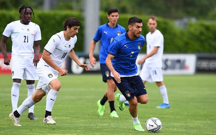 Sabato di campo per gli Azzurri che Roberto Mancini non ha impiegato dal primo minuto nel 4-0 di Bologna contro la Repubblica Ceca, ottava vittoria di fila senza subire gol per la Nazionale. In mattinata i giocatori che sono subentrati o sono rimasti in panchina ieri sera nel test del Dall'Ara hanno sfidato nel centro tecnico federale di Coverciano l'Under 20, in una sgambatura vinta per 1-0 dai ragazzi allenati da Andrea Bollini. Il gol che ha deciso la partita, giocata su due tempi da 20 minuti l'uno, è stato realizzato con un destro a giro da Gianmarco Cangiano, attaccante nato nel 2001 che nella scorsa stagione ha giocato all'Ascoli in prestito dal Bologna.