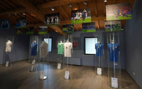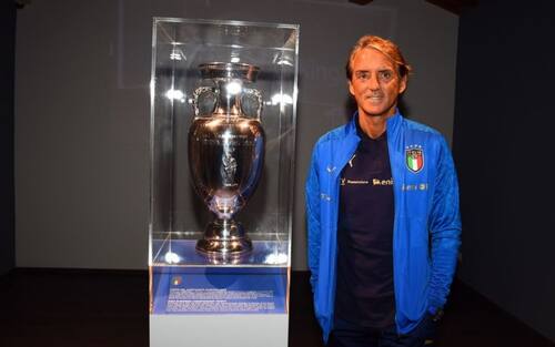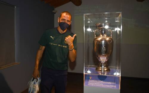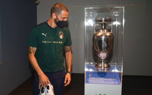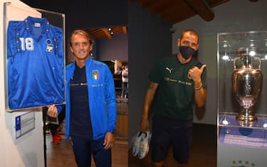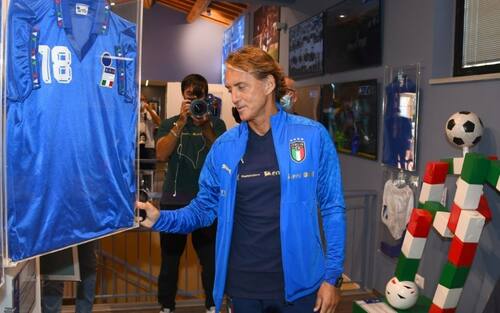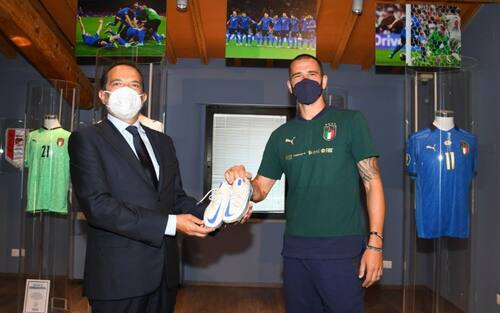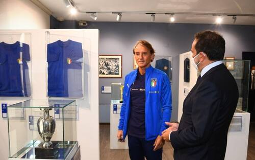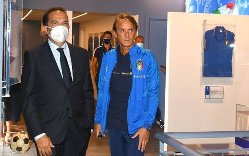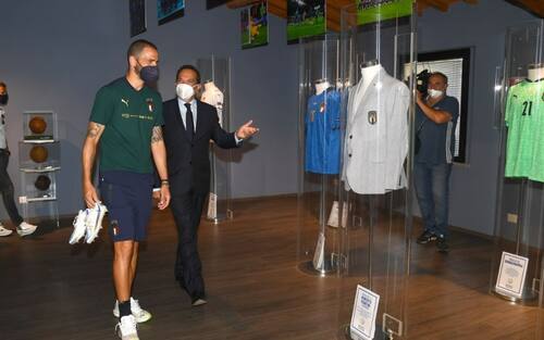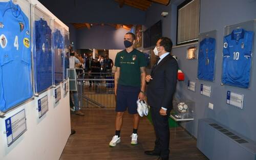 Il Ct azzurro e Leonardo Bonucci hanno fatto tappa al Museo del Calcio di Coverciano per visitare la nuova sala dedicata alla Coppa di Euro 2020. Mancini ha firmato la giacca della sua divisa ufficiale mentre il difensore ha donato al Museo i suoi scarpini, che riportano la data di esordio in Azzurro e quella della sua centesima partita con la Nazionale. Ad accoglierli il Presidente della Fondazione Museo del Calcio, Matteo Marani