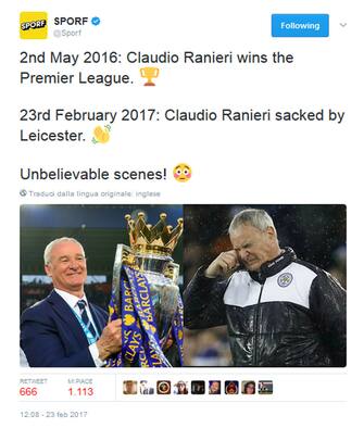 Una notizia che sta facendo il giro del mondo, tanto quanto l’impresa che l’ha reso eterno. Scatena polemiche a non finire l’esonero di Claudio Ranieri dal Leicester, club condotto solo 9 mesi fa al primo titolo in Premier League in 132 anni di storia. A togliersi il cappello si unisce pure José Mourinho dai trascorsi tutt’altro che pacifici con Ranieri. Dinanzi all’entusiasmante cavalcata del Leicester, tuttavia, lo stesso Mou si era unito agli applausi per il manager romano chiamato “amico” -