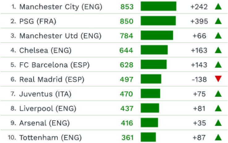 Nella top 10 delle squadre più costose ci sono ben 6 club inglesi: Manchester City, Manchester United, Chelsea, Liverpool, Arsenal e Tottenham. La Premier League è infatti il primo campionato per costo complessivo delle rose (5.7 miliardi). La Serie A occupa il secondo posto (2.4) davanti a Liga (2.2), Bundesliga (1.9) e Ligue 1 (1).