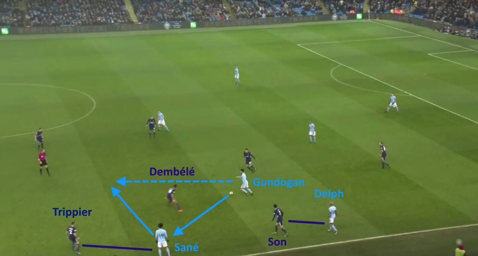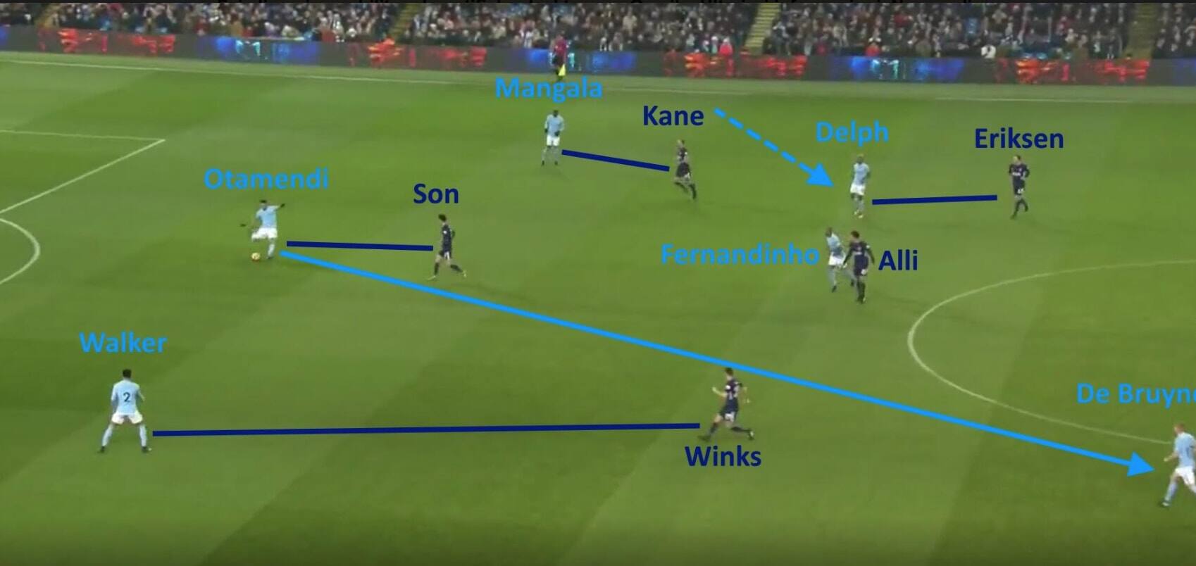 In questo modo il City ha spezzato la connessione tra Eriksen e gli altri due grandi talenti della squadra, Kane e Alli. La capolista in pratica ha giocato una fase difensiva rimasta solo nelle intenzioni del Tottenham. Quando i padroni di casa costruivano da dietro, Kane e Son schermavano i difensori centrali, Alli si metteva su Fernandinho e le mezzali si orientavano sui terzini con l’intento teorico di portare il City a giocare internamente, dove il Tottenham poteva contare su un uomo in più. La pressione alta degli "Spurs" si è però rivelata inefficace: Eriksen e Winks non riuscivano ad uscire con i tempi giusti su Walker e Delph – che come al solito sull’uscita palla si è affiancato a Fernandinho – e quando si alzavano sui difensori con troppo anticipo scoprivano la linea di passaggio per le mezzali. Se invece rimanevano in posizione permettevano ai terzini la ricezione e la giocata.