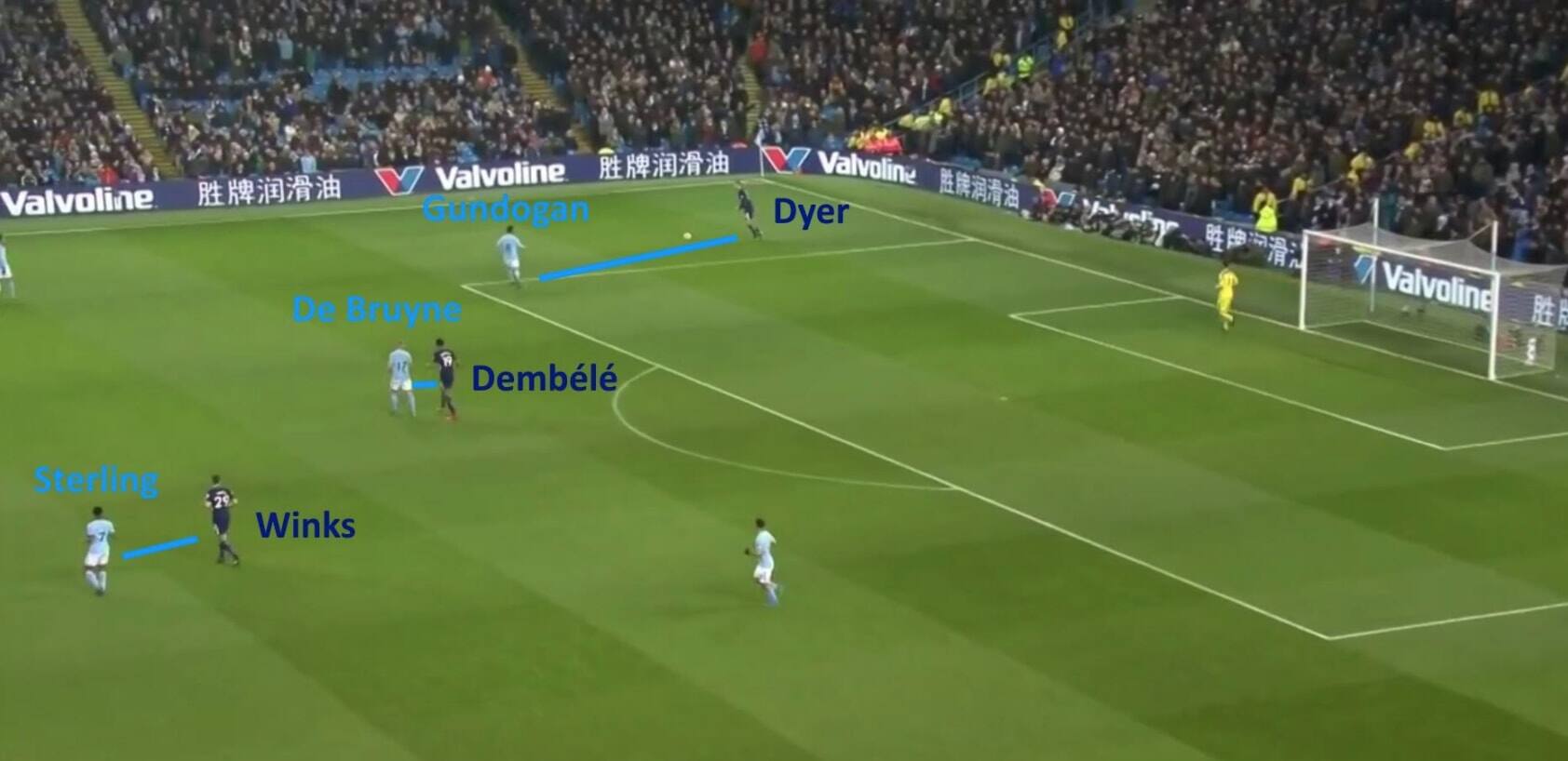 La pressione alta del Man City: Gundogan - scelto al posto di David Silva - esce su Dier, De Bruyne prende Dembélé mentre Sterling si accentra per marcare Winks.