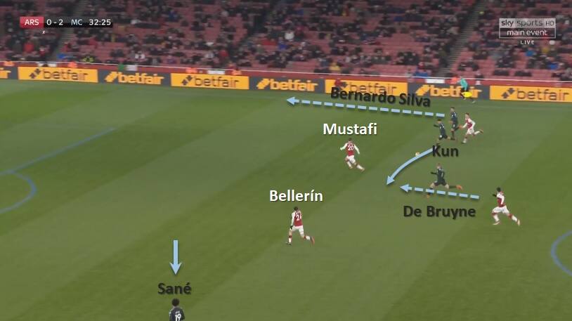 A quel punto l’azione diventa puramente verticale: i giocatori dell’Arsenal sono tutti girati e stanno correndo verso la propria porta. Alla destra del “Kun” accompagna Bernardo Silva, mentre dentro al campo c’è De Bruyne. L’argentino sceglie di passare verso il belga e a questo punto, con un tempismo quasi cinematografico, entra nell’inquadratura anche Sané, rimasto per tutto il tempo dell’azione larghissimo a sinistra. De Bruyne avanza ma si inizia ad intuire come andrà a finire.