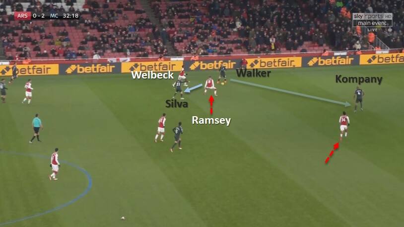 Contro pronostico e dimostrando un’intensità notevole, l’Arsenal riesce immediatamente a pressare lo spagnolo, e anche Agüero, che riceve il successivo passaggio e rigioca dietro per Silva, allontanatosi quel tanto che basta da Ramsey per darsi il tempo di giocare verso Walker.