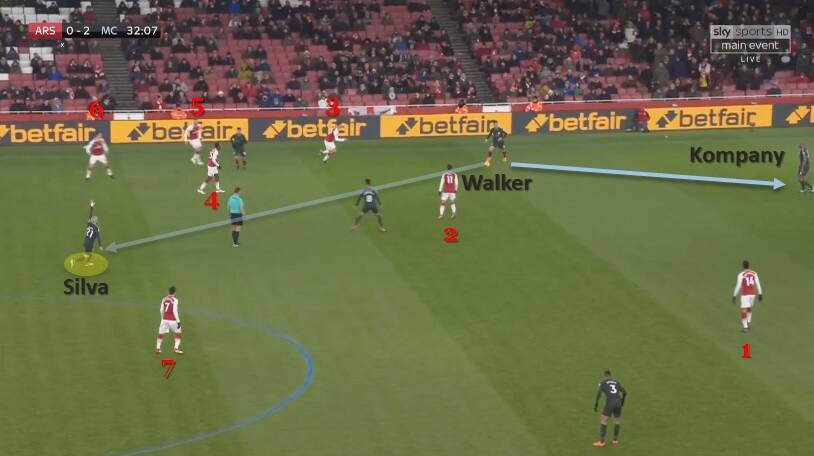 Da Agüero la palla torna a Walker, smarcato, che si ritrova con una linea di passaggio diagonale verso Silva che taglierebbe fuori addirittura sette giocatori avversari, ma, nonostante una prospettiva così favorevole, non si fida di né di giocare di prima, né con il suo sinistro e compie un passaggio all’indietro verso Kompany, dando all’Arsenal possibilità, almeno a prima vista, di ricompattarsi.