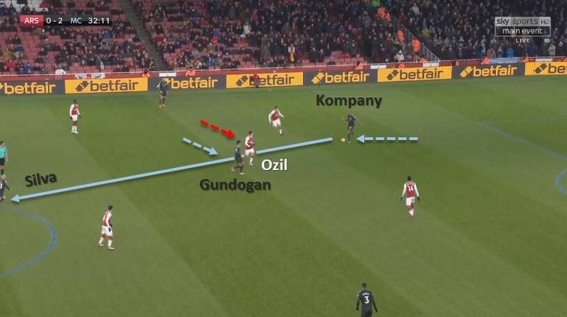 Il City riesce però a manipolare nuovamente il pressing avversario con Kompany che conduce la palla e Gundogan che si abbassa con un movimento diagonale e sembra volersi offrire per un passaggio, ma in realtà ha il solo scopo di portarsi dietro Ozil. La prima mossa attira Xhaka, rimasto altissimo sul belga, la seconda allarga lo spazio a disposizione del portatore, sbloccando definitivamente la linea di passaggio per Silva, rimasto in posizione.