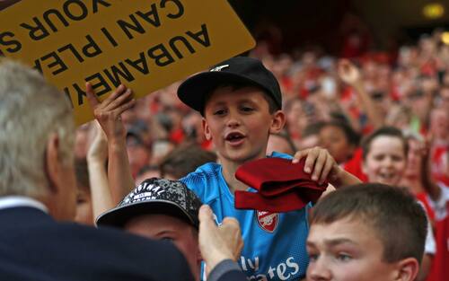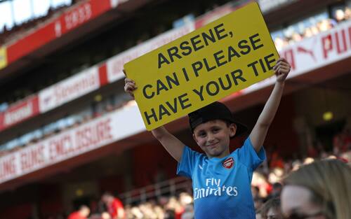 Questo piccolo tifoso chiede un piccolo souvenir a Wenger, anche se molto originale: la sua storica cravatta rossa