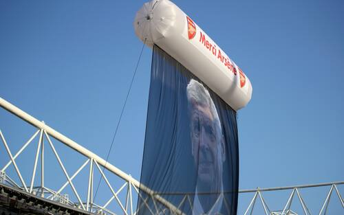 Nel frattempo un altro dirigibile mette in mostra tutti i trofei vinti da Wenger all'Arsenal, dei Gunners il francese è stato l'allenatore più longevo e vincente di sempre
