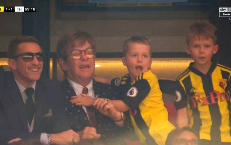 Elthon John, grande tifoso del Watford, festeggia allo stadio coi figli Zachary ed Elijah (foto Sky Sports)