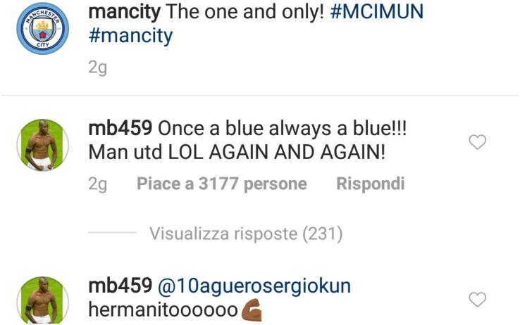 Pep Guardiola, al triplice fischio dell'arbitro, è andato a rimproverare Sterling per aver deriso gli avversari con qualche giocata di troppo nei minuti di recupero. Un gesto elegante dell'allenatore catalano che nulla ha tolto, però, al dominio incontrastato che si è visto nel rettangolo di gioco. Il successo del City, nel derby contro lo United, non è mai stato infatti in discussione. Il calcio di rigore trasformato da Martial - dopo l'uno-due tra primo e secondo tempo di David Silva e Aguero - ha, probabilmente, sollevato qualche timore, ma alla fine la rete di Gündoğan ha messo il sigillo sull'incontro e sui tre punti. A fine partita, come ogni stracittadina che si rispetti, non sono mancati gli sfottò e le prese in giro nei confronti di giocatori e supporters dei Red Devils. Solitamente, a meno che non si tratti come in questo caso di match dal significato molto più profondo rispetto ad altre partite, spettano ai tifosi, ma ogni tanto vengono fuori anche da parte degli stessi protagonisti in campo. E in altri casi ancora arrivano... dagli ex. Tra coloro che si sono presi gioco dello United c'è stato, infatti, anche Mario Balotelli, dal 2010 al 2013 attaccante del City con la quale ha vinto anche una Premier. L'attaccante azzurro, oggi in forza al Nizza, ha commentato un post Instagram dei Citizens in cui si celebrava la vittoria per 3-1 ottenuta ai danni dei cugini. "Once a blue always a blue!" ha scritto SuperMario, ovvero "una volta stato nei blu, si resta per sempre blu". Il classe '90 non si è fermato lì e ha stuzzicato ulteriormente i Red Devils, aggiungendoci: "Manchester United LOL ancora e ancora", sottolineando come il bilancio nei confronti diretti si stia equilibrando sempre di più grazie agli ultimi successi maturati dal City. Proprio Balotelli fu uno dei protagonisti di uno dei derby più clamorosi di sempre, con i Citizens che vinsero contro i rivali con il punteggio di 6-1. Gli anni sono passati, ma il suo cuore resta sempre blu.