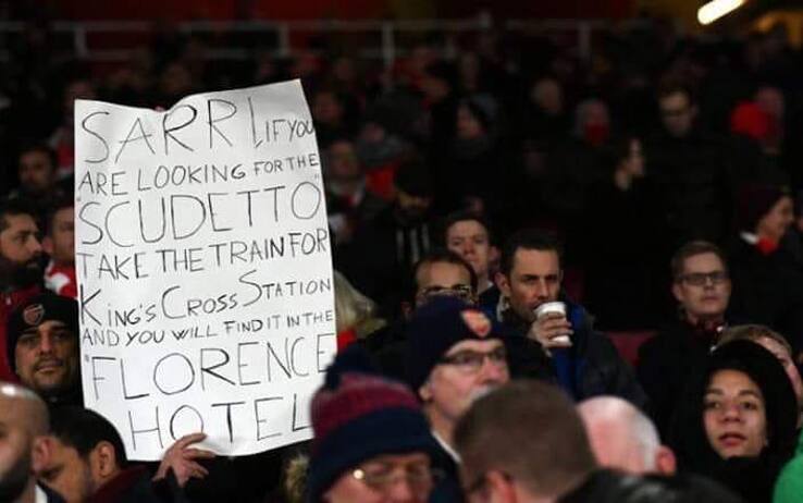 Nel corso del derby tra Arsenal e Chelsea, all'Emirates è spuntato uno striscione di sfottò nei confronti di Sarri: ""Se stai cercando lo scudetto prendi il treno per la stazione di King’s Cross e lo troverai al Florence Hotel", facendo riferimento allo scudetto perso in hotel a Firenze, quando la Juve vinse a San Siro con l'Inter