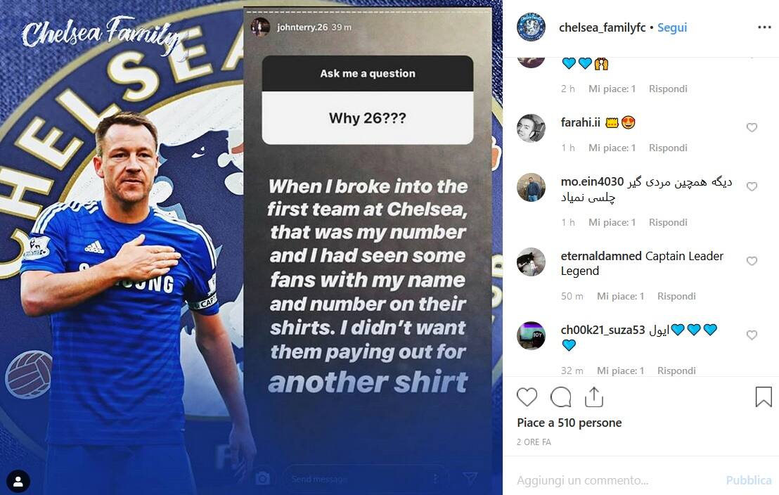 Il modo più semplice per scoprirlo è stato chiederglielo direttamente, come hanno fatto alcuni fan nel corso di una "chiacchierata" attraverso Instagram, durante la quale Terry si era reso disponibile per rispondere alle domande dei tifosi. E la fatica "Why 26?" alla fine è arrivata, con una risposta che sicuramente ha soddisfatto tutti i curiosi.
