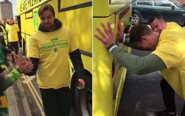 Qualcosa però è andato storto, e ben presto i giocatori si sono ritrovati a salutare i fan in strada: appiedati e costretti a scendere dal bus a causa di un guasto che lo aveva fermato in mezzo a una via. Qualcuno, birra da festeggiamento in mano, non ha perso però la voglia di riderci su e così, una volta scesi, un paio di giocatori si sono simpaticamente prestati alla gag. Mani appoggiate sul pullman e tentativo di spingerlo per farlo ripartire, con i tifosi divertiti pronti a riprendere la scena. Non sarà certo un bus fermo a rovinare la festa dei Canaries