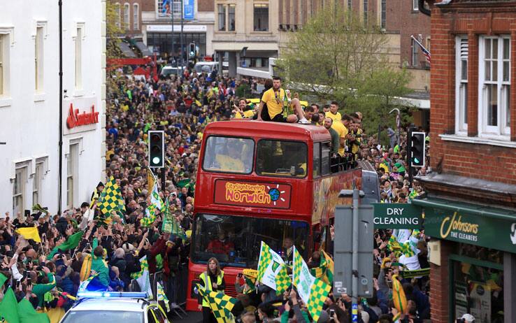 Vittoria per 2-1 in casa dell'Aston Villa e risalita in Premier League per il piccolo Norwich, primo in Championship. Vuoi non festeggiare la promozione? Nella cittadina è stata così organizzata la classica parata, con tutti i giocatori a bordo del pullman scoperto pronti a salutare dall'alto i loro tifosi.