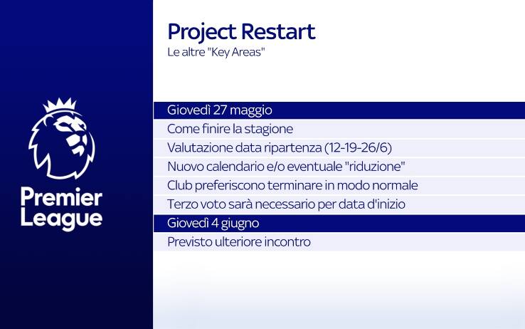 Approvato all'unanimità questo punto fondamentale, ora la Premier League dovrà discutere nella giornata di giovedì 28 maggio tutti gli altri aspetti del Project Restart. Tra questi, uno dei principali riguarderà l'assegnazione dei verdetti (titolo di campione, posti in Europa, retrocessioni e promozioni) nel caso in cui non si riuscisse a completare il campionato. La volontà di tutti, già dichiarata, è quella di giocare le 92 partite restanti, ma tutto sarà legato all'ok definitivo del governo e alla presentazione del protocollo per tornare a disputare le partite, che avrà come priorità quella di salvaguardare la salute di calciatori, staff e tifosi. Quando si ripartirà? La data ipotizzata, al momento, è quella del 19 giugno. Nulla di sicuro però, la Premier League avanza a piccoli passi e il ritorno agli allenamenti di gruppo con contatto rappresenta un punto fondamentale per la ripresa del campionato.