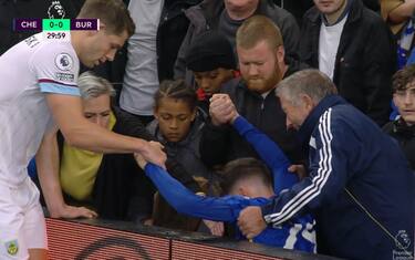 Azione d'attacco al 30' di Chelsea-Burnley (finita 1-1): Havertz vola via sulla sinistra e prova a mettere in mezzo ma lo scontro con un avversario lo fa letteralmente 'volare' tra il pubblico. Dopo un paio di minuti per riprendersi, aiutato prima da alcuni tifosi, poi dallo staff medico dei Blues, torna in campo e mette a segno il gol del vantaggio che non basterà ai ragazzi di Tuchel raggiunti al 79' da un gol di Vydra. Le immagini
