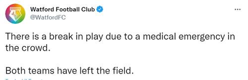 Il Watford comunica subito il motivo della sospensione: una emergenza medica in tribuna