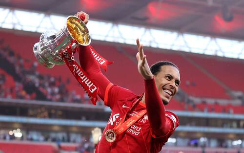 Scatta la festa e... si rompe la coppa. Quella che ha in mano Van Dijk, anche se non sembra più, è infatti la FA Cup, che nel corso dei festeggiamenti perde qualche pezzo...