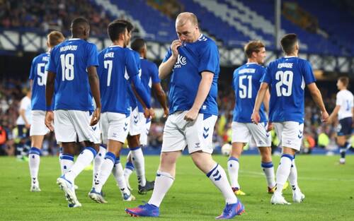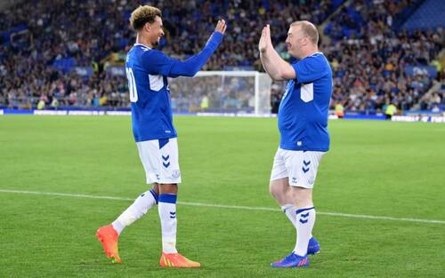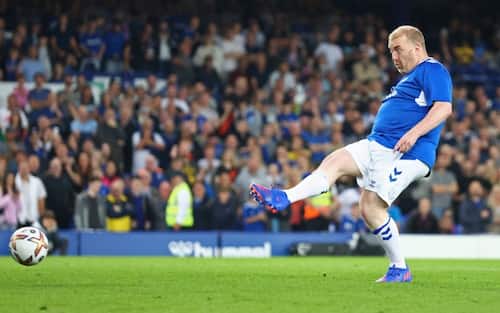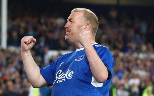 - Anche i giocatori dell'Everton hanno partecipato alla gioia del loro tifoso, correndo ad abbracciarlo dopo il rigore segnato