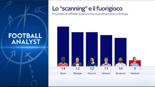- Grazie allo scanning, Haaland evita anche il fuorigioco. In stagione, infatti, gli sono stati fischiati solo due offside. Un dato incredibile anche in confronto ai migliori negli altri top 5 campionati europei. Basti pensare che il suo "rivale" del Liverpool, Darwin Nunez, ha una media di 1,8 offside a partita.