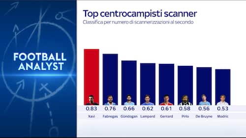 - Nello studio è emerso che gli scanners migliori sono i centrocampisti, ma il migliore in assoluto è Xavi. L'ex Barcellona vantava 0,83 scan al secondo. Completano il podio Fabregas (0.76) e Gundogan (0.66). Cosa hanno in comune questi tre giocatori? Sono stati allenati tutti da Guardiola