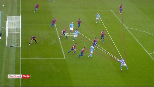 - Il secondo gol analizzato è sempre nella partita contro il Crystal Palace, quello del definitivo 4-2. Qui Haaland gestisce l'avversario vicino a lui, distante appena 3,86 metri.