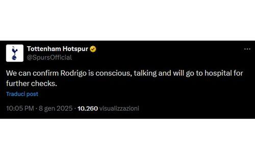 - "Bentancur è cosciente, parla e sarà sottoposto ad accertamenti in ospedale", comunica il Tottenham