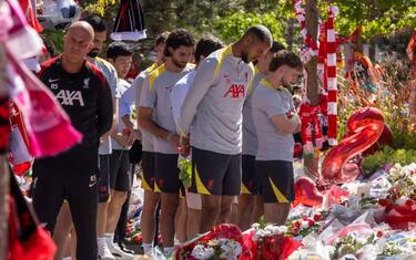 I giocatori del Liverpool hanno voluto ricordare ad Anfield Diogo Jota, l'attaccante scomparso lo scorso 3 luglio a seguito di un incidente stradale insieme al fratello Andrè Silva. Da Van Djik fino agli ex Gerrard e Lallana: le immagini dell'omaggio dei Reds