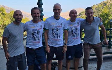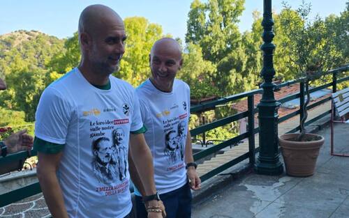 Mattinata al Santuario di Santa Rosalia per Pep Guardiola, a poche ore dall'amichevole al Barbera tra Palermo e Manchester City. Insieme al suo staff (tra loro anche il director of performance, Federico Genovesi), l'allenatore dei citizen è salito a piedi su Monte Pellegrino fino alla Sacra Grotta, accolto dal reggente don Natale Fiorentino. Guardiola ha omaggiato Falcone e Borsellino indossando la maglia della seconda edizione della "Mezza maratona della Memoria", nel ricordo dei due magistrati