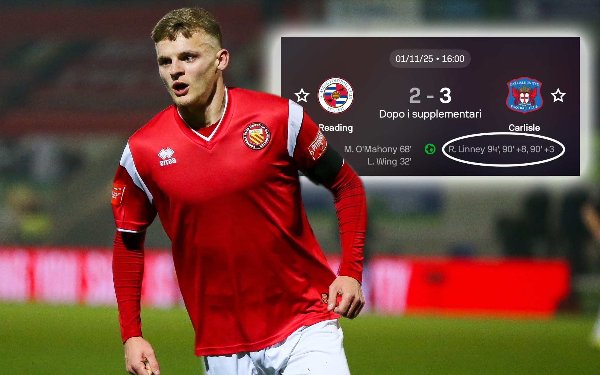 Per capire bene il tabellino di Reading-Carlisle United serve guardarlo un paio di volte, almeno. Anche perché — come fosse uno scherzo del tempo — sembra quasi che Regan Linney abbia segnato il suo terzo gol personale prima del secondo. Possibile? Sì , se numeri alla mano hai firmato l'incredibile rimonta della tua (piccola) squadra dallo 0-2 con due reti in pieno recupero al 93' e al 98', cioè al 90'+3 e al 90'+8 (per scriverlo bene), e poi ne hai fatto un terzo al 94', non inteso come quarto minuto di recupero ma quarto minuto dei supplementari. Il punto è che li ha fatti tutti lui, da solo, nel giro di meno di dieci giri d'orologio. Ah, era subentrato dalla panchina…