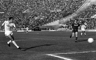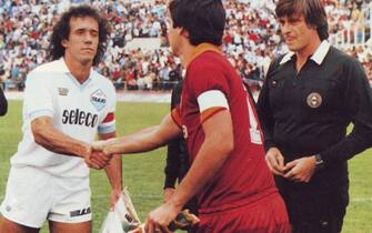 Nell'ottobre 1983, la Lazio si presenta al derby di andata con una maglia completamente bianca, con solo qualche accenno di celeste sulle maniche e nel colletto. Non ci fu niente da fare contro lo squadrone di Nils Liedholm, che si impose 2-0 (Foto web) -