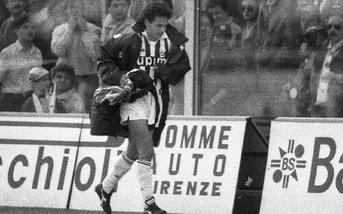 Una foto storica: rappresenta la prima volta di Baggio al Franchi con la maglia della Juventus. Il Divin Codino, in campo, rifiutò di battere un rigore e quando uscì i tifosi gli lanciarono una sciarpa viola che lui raccolse e portò con sé negli spogliatoi -